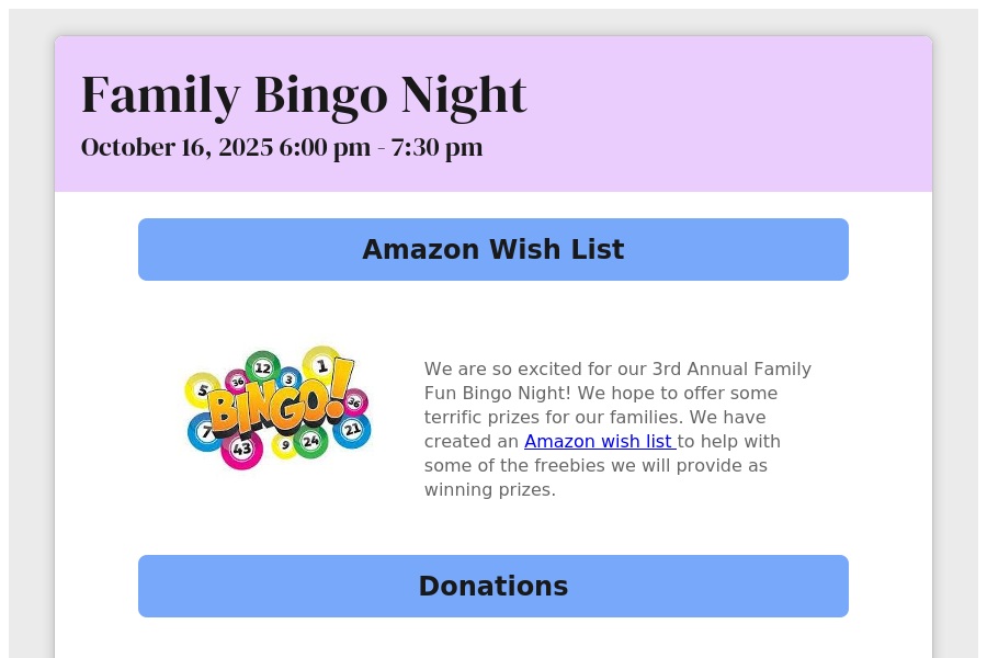 Family Bingo Night October 16, 2025 6:00 pm - 7:30 pm Amazon Wish List We are so excited for our 3rd Annual Family Fun Bin. . .